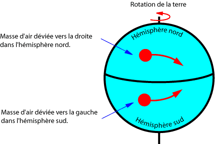 La Terre tourne autour de son axe de l'ouest vers l'est, une fois toutes les 24 heures. Cette déviation va vers la droite, dans l'hémisphère Nord et en sens inverse, vers la gauche, dans l'hémisphère Sud.